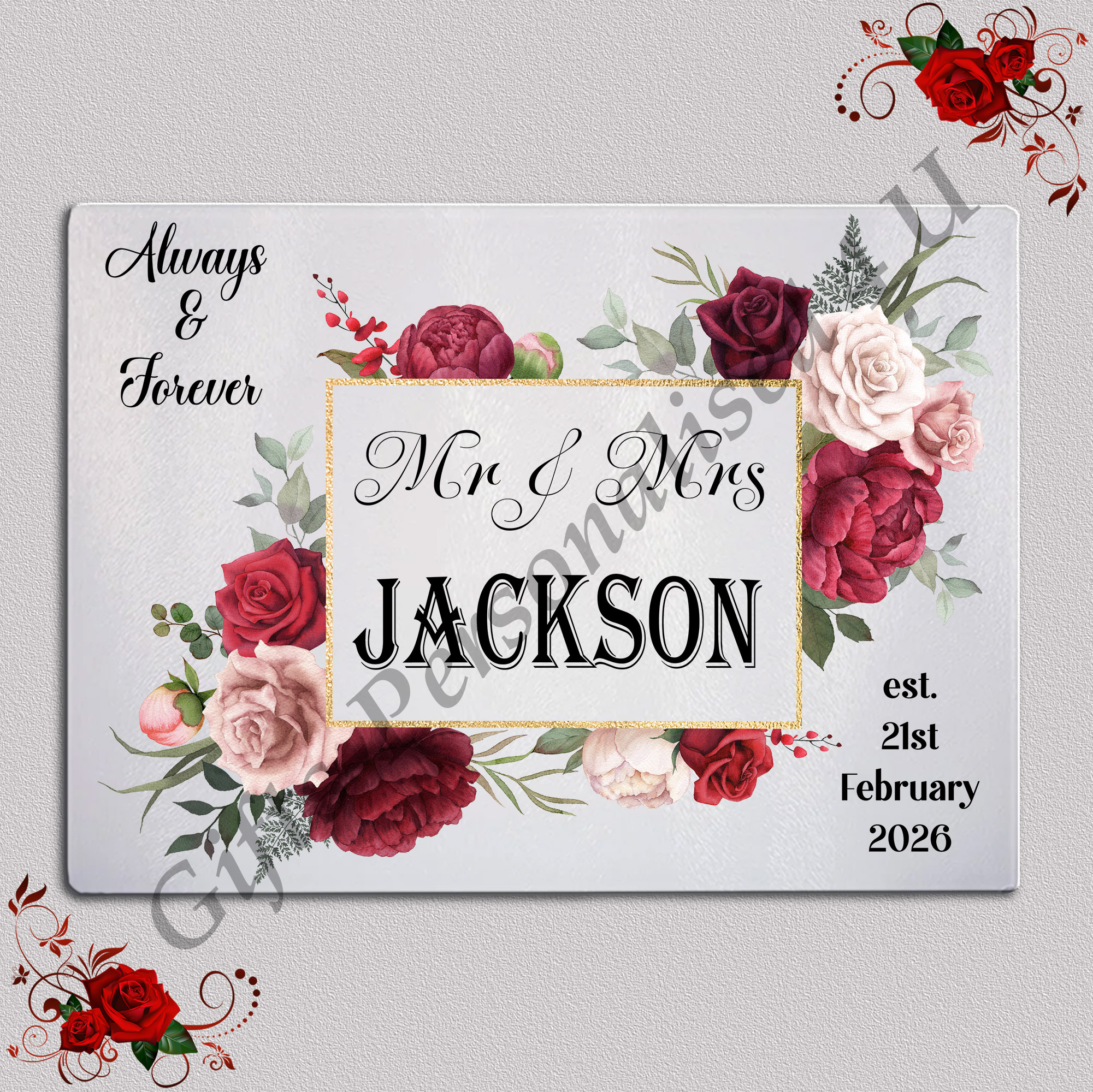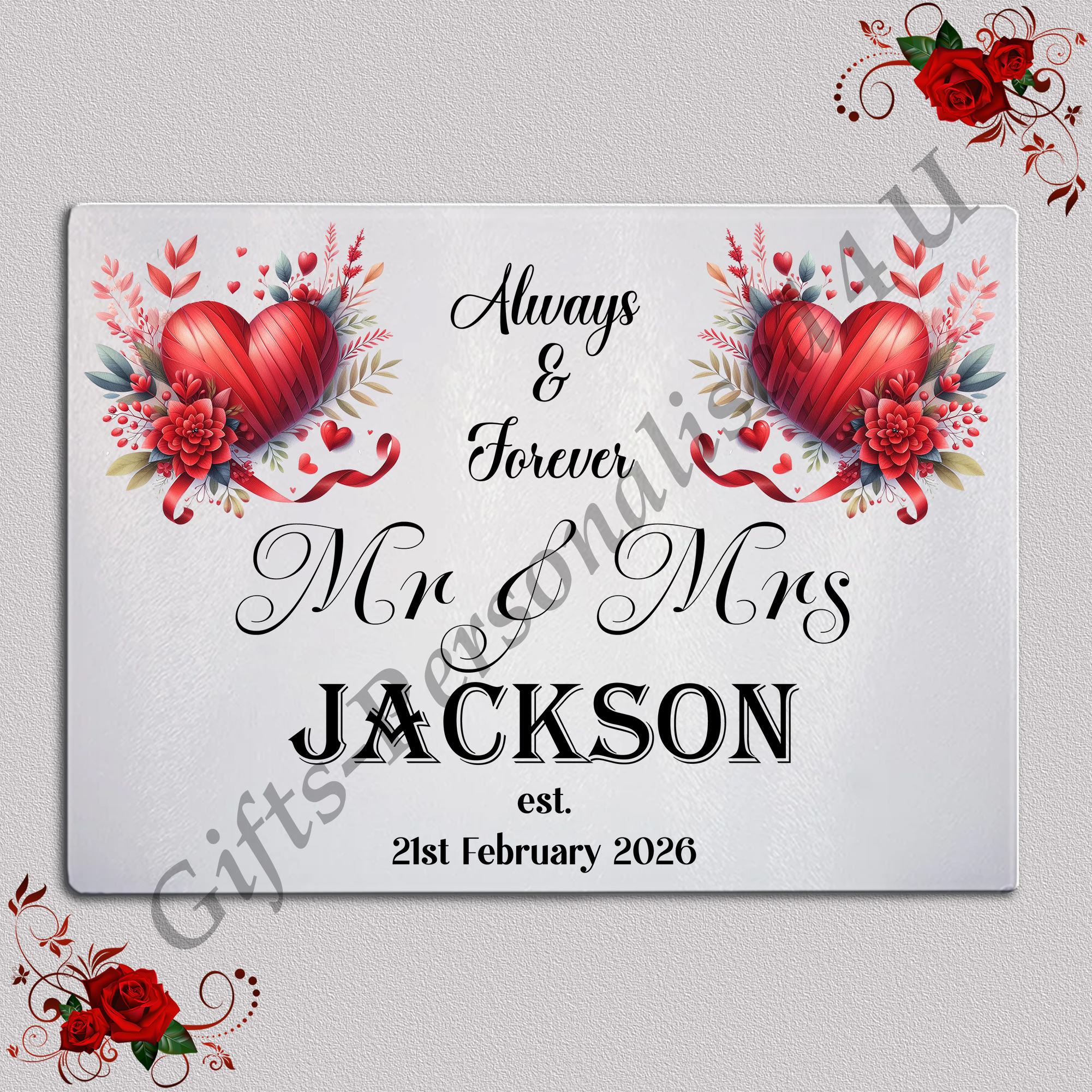 Celebrate love with a beautifully personalised glass chopping board, perfect for weddings, anniversaries, engagements, or Valentine’s Day. Featuring elegant artwork and custom names and dates, this keepsake gift is both practical and meaningful.